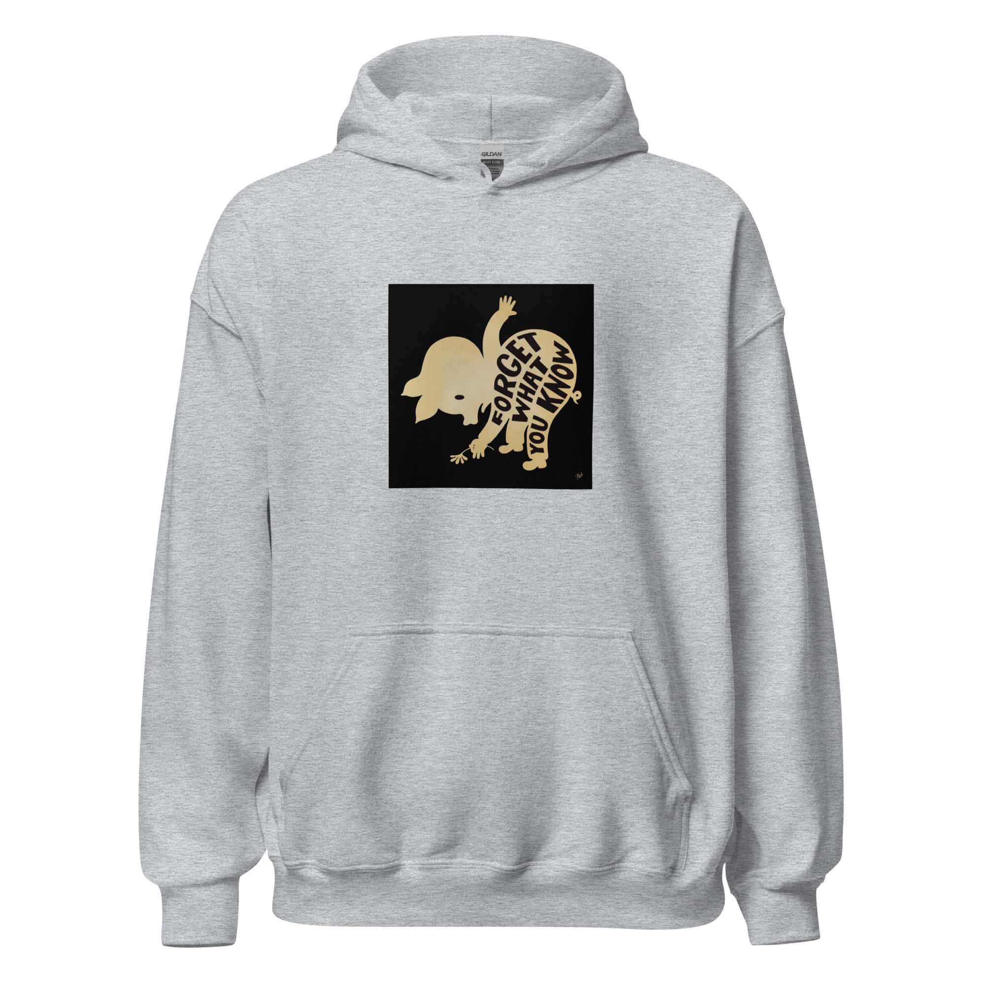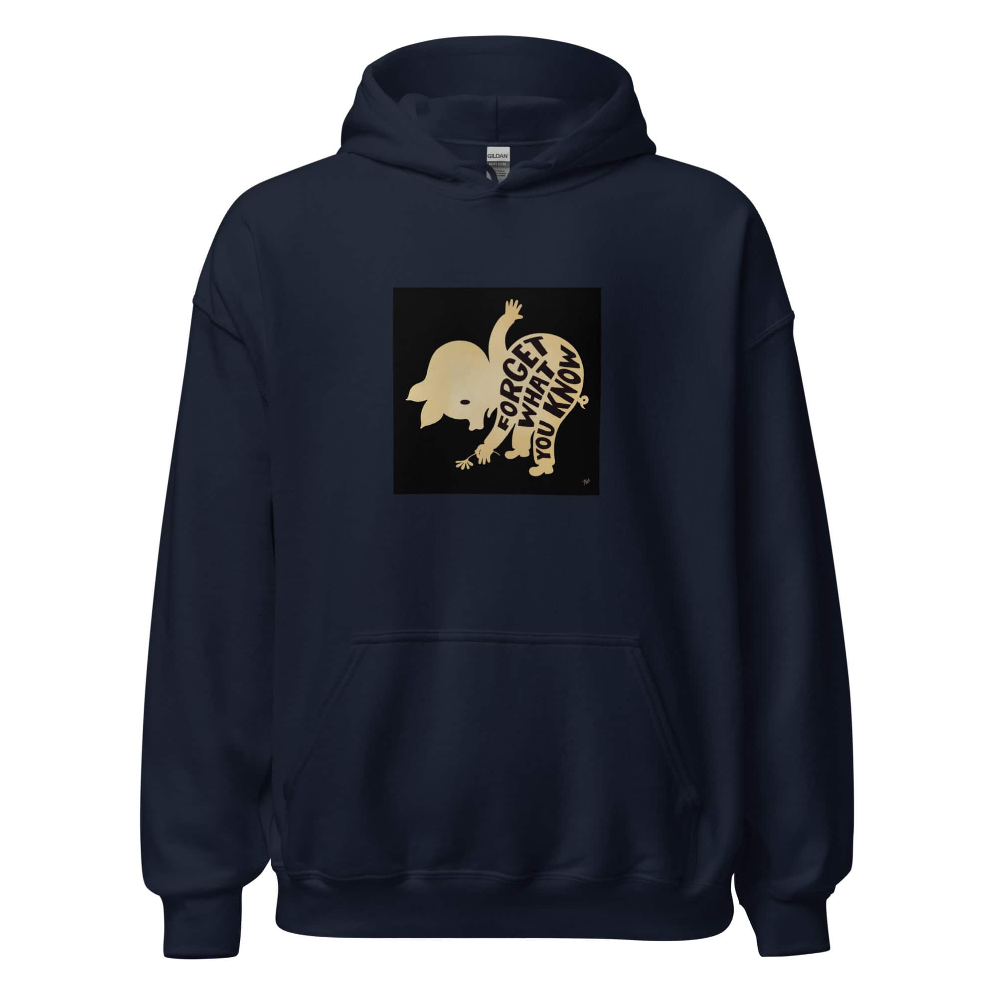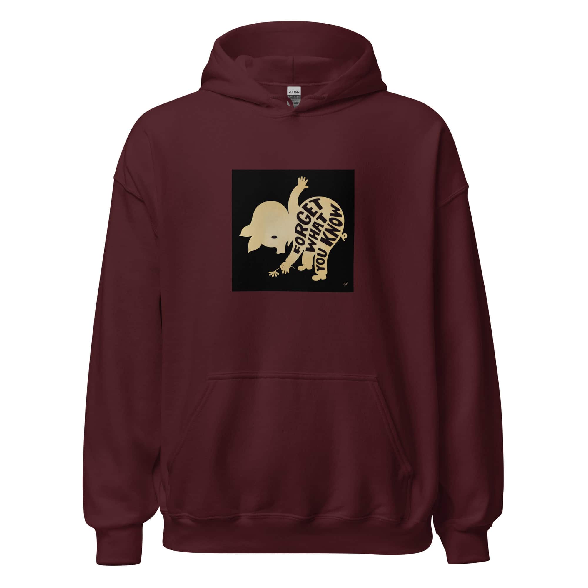 “Forget What You Know” hoodie by Gary Taxali. Wearable pop art gifts from a Library of Congress collected artist.
