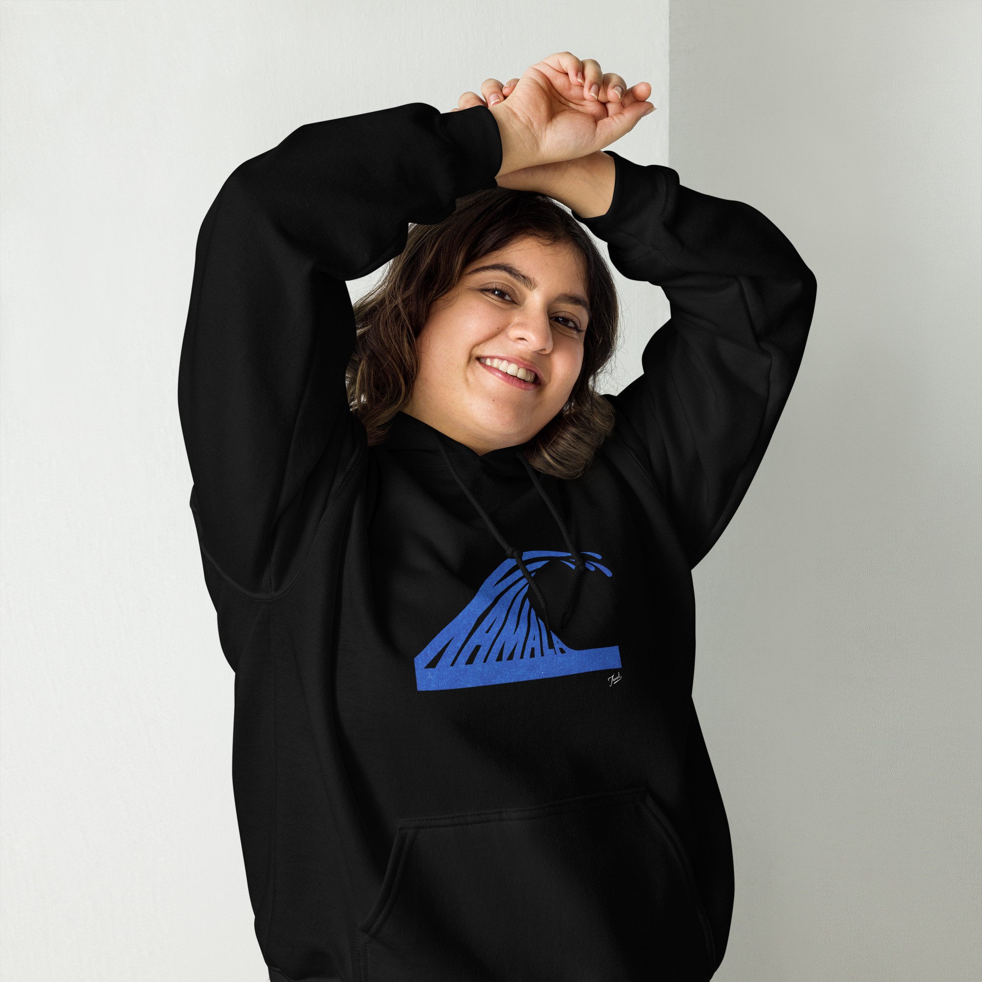 Taxali teaches design at OCAD University — the precision of his pedagogy shows in the “Kamala Wave” composition. Fleece-lined and pre-shrunk, this “Kamala Wave” hoodie carries the artwork through season after season.