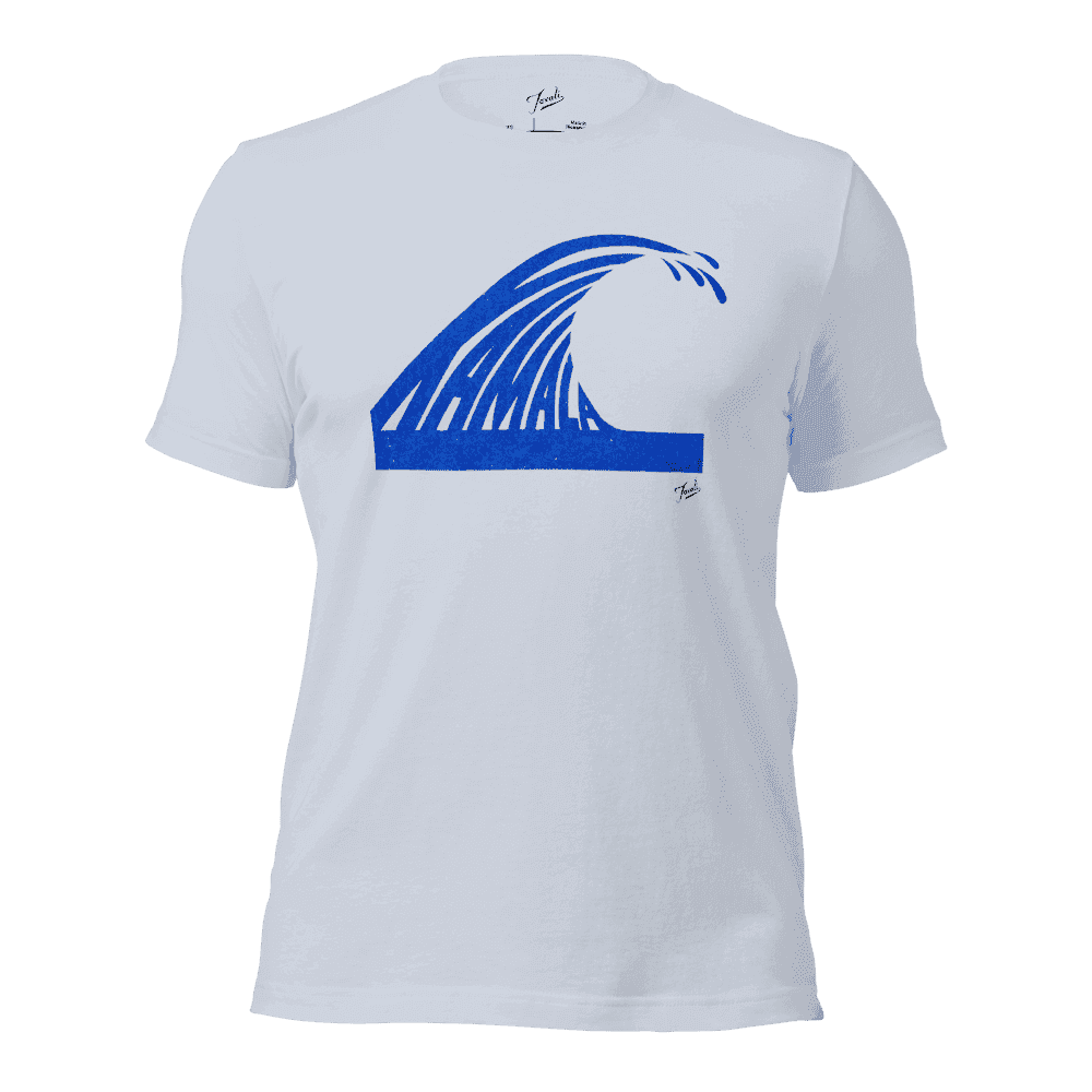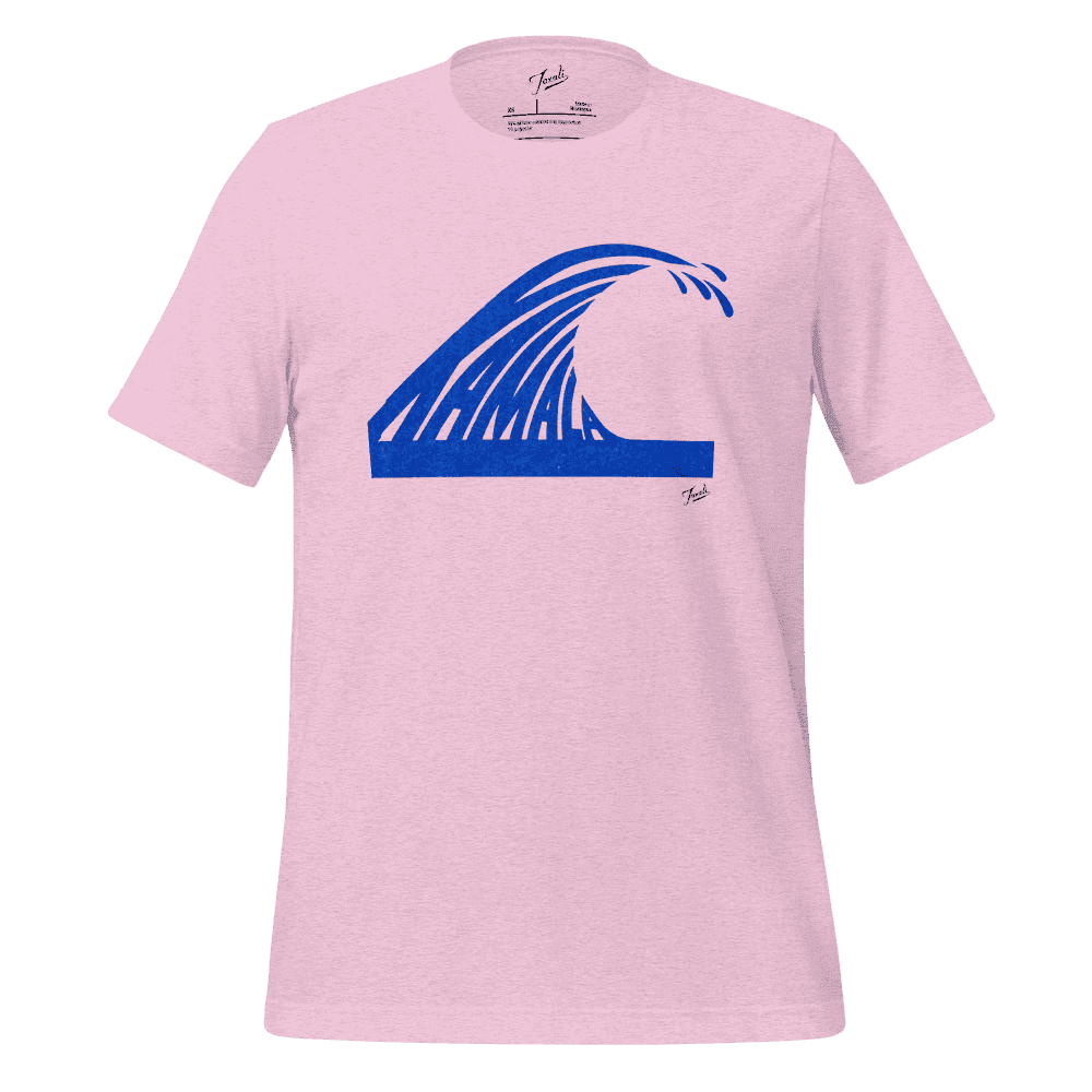 This artist t shirts features “Wave” by Gary Taxali. The “Wave” design is printed with water-based inks that stay vibrant wash after wash.