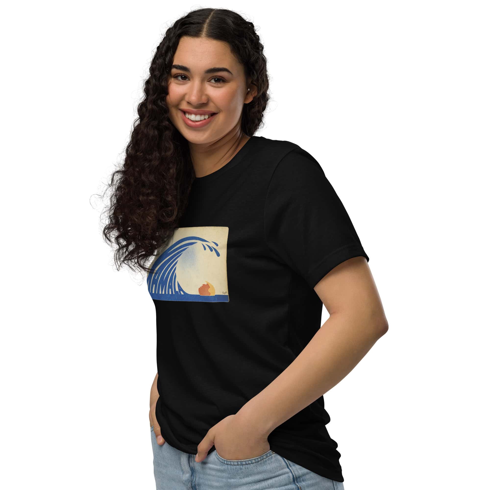 “Kamala Wave” by Gary Taxali on a premium t-shirt. Cut from ringspun cotton, this “Kamala Wave” tee carries the artwork at full resolution via DTG printing. The “Kamala Wave” design is printed with water-based inks that stay vibrant wash after wash.