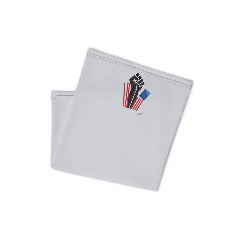 “Black Lives Matter” by Gary Taxali on a premium face covering. Taxali’s “Black Lives Matter” wraps this versatile gaiter — usable as a headband, bandana, or face covering.