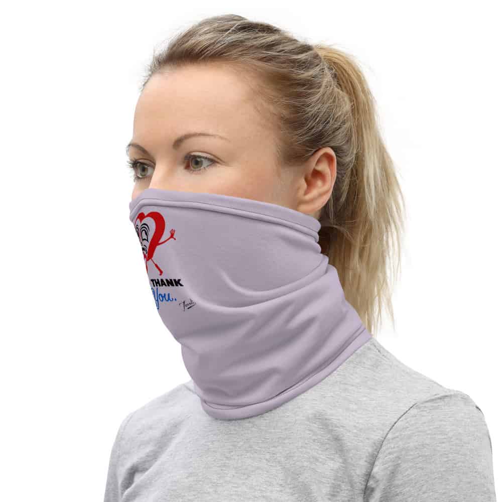 Taxali co-founded the Illustrators’ Partnership of America, bringing professional standards to the field that produced “No Thank You”. Taxali’s “No Thank You” wraps this versatile gaiter — usable as a headband, bandana, or face covering.