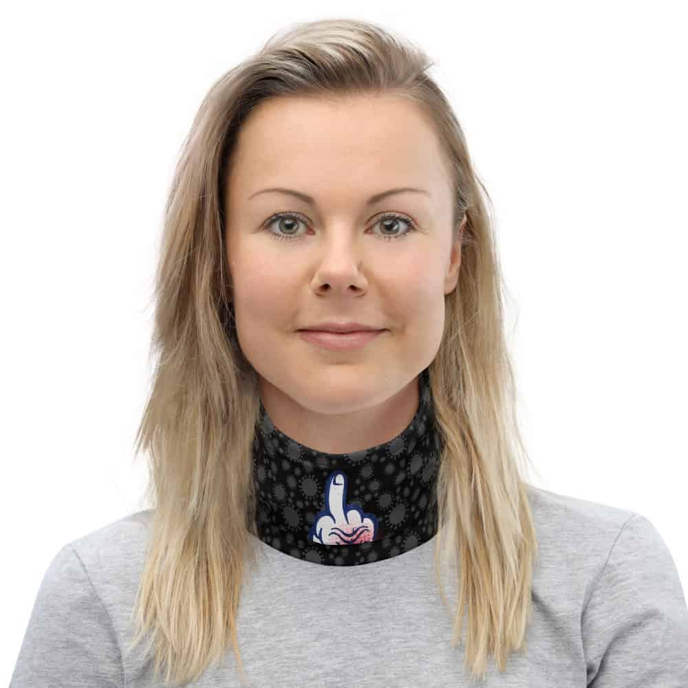 Gary Taxali’s “@#%&*! the Virus” artwork on a pop art face mask. “@#%&*! the Virus” on this gaiter brings Taxali’s pop art into functional, multi-purpose outdoor wear.