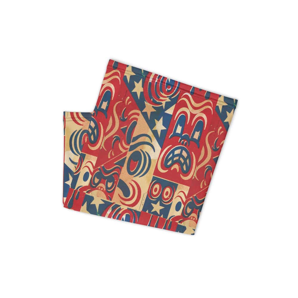 Three published monographs chronicle the career behind this “USA Paranoia” gaiter. Taxali’s “USA Paranoia” wraps this versatile gaiter — usable as a headband, bandana, or face covering.