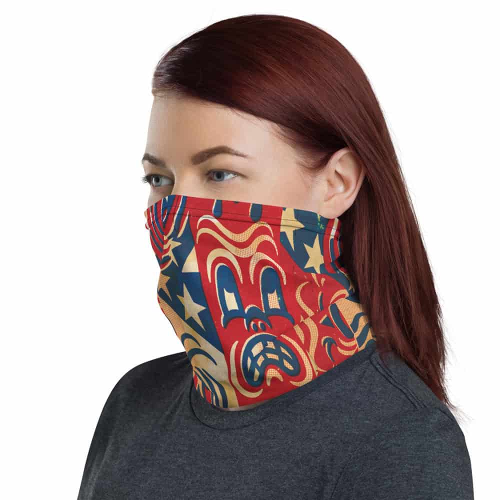 Gary Taxali’s “USA Paranoia” artwork on a pop art face mask. This “USA Paranoia” gaiter is cut from moisture-wicking microfibre with Taxali’s design printed edge to edge.