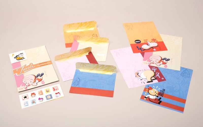 Each set includes 8 letter sheets (four different styles), 6 envelopes (4 different styles), and a set of stickers. Packaged as a work of art itself with a printed belly-band all inside a poly bag.